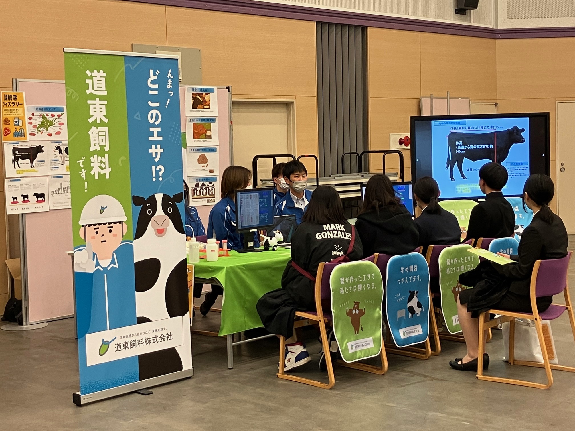 道東飼料では、社員一同で製品の製造工程についてのご説明を行ったほか、クイズ形式の体験コーナーを設け、学生の皆さんに楽しみながら当社の仕事を知っていただきました。